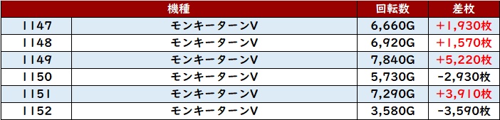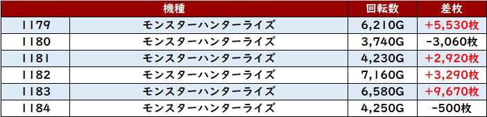 続いて「モンハンライズ 1179~1184」も半数以上が差枚数+2,900枚超えを記録!