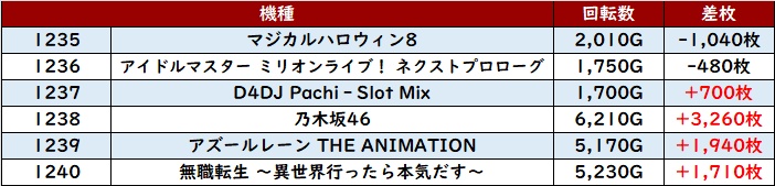 朝イチは「東京喰種」「北斗転生2」「からくりサーカス」「スマスロ北斗」「炎炎2」「マギレコ」の順で埋まっていき、スマスロが高稼働となった。