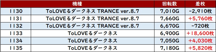 まずは「ToLOVEるトランス~ToLOVEる 1130~1135」6台中4台が差枚数+4,000枚超えの大幅プラス差枚に!