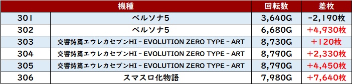 続いて「カバネリ~ペルソナ5 295~300」が6台中4台が大幅プラス差枚を記録!
