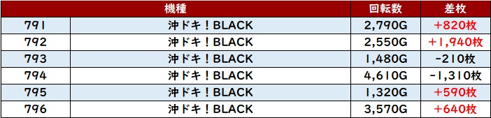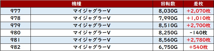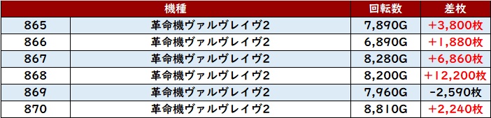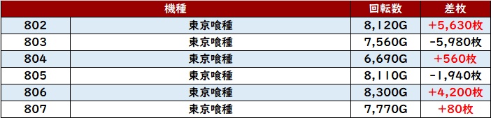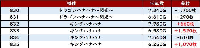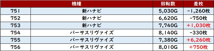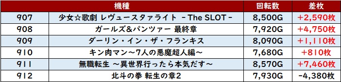 続いて「スタァライト~北斗転生2 907~912」も6台中5台がプラス差枚と好調な結果を残す!