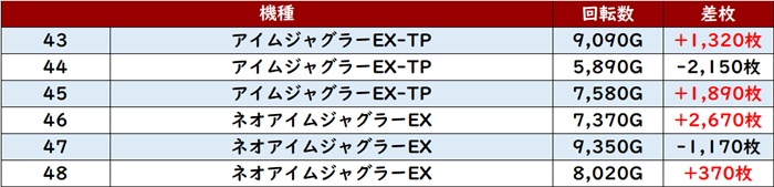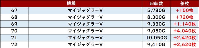 続いて「マイジャグ5 67~72」が差枚数+4,040枚を筆頭に全台プラス差枚と大盛況!