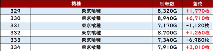 朝イチは「東京喰種」「ヴヴヴ」「ヴヴヴ2」「北斗転生2」などスマスロ人気機種から埋まり、その他「マイジャグ5」が9割程の稼働率となった。
