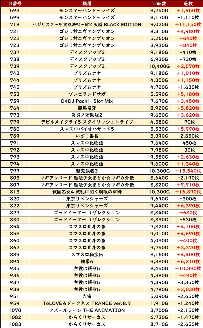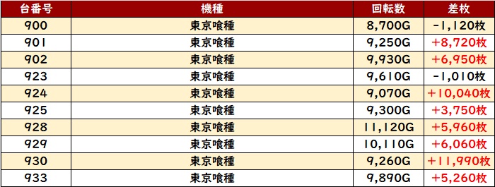 どちらも多くのユーザーが粘り続けており、「東京喰種」に至っては差枚数+1万枚超えの台を複数排出していた!