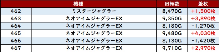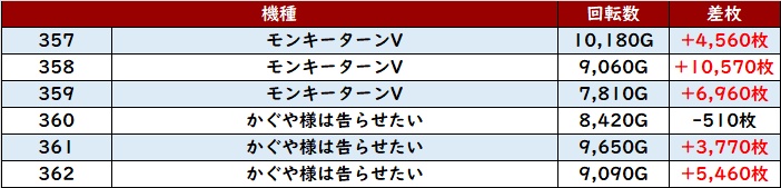 更に「モンキー5~かぐや様 357~362」6台中5台が大幅プラス差枚と絶好調!