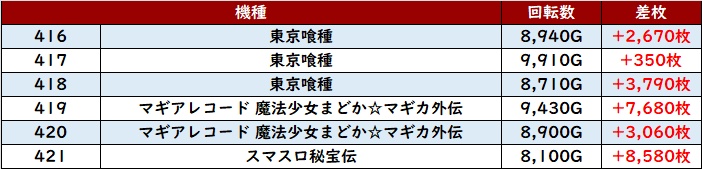 まずは「東京喰種~スマスロ秘宝伝 416~421」全台プラス差枚と充実感満載の結果を記録!