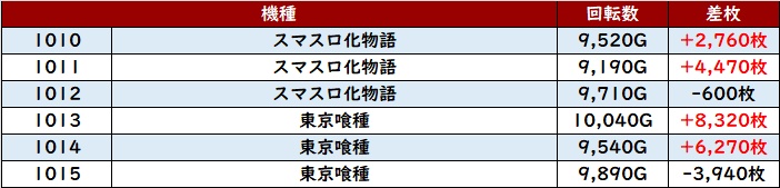 また「スマスロ化物語~東京喰種 1010~1015」も回転数9,100G超えと稼働の高さが目立つ結果に!