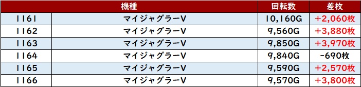 まずは「マイジャグ5 1161~1166」が回転数9,500G超えの高稼働を記録!