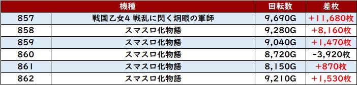 まずは「乙女4~スマスロ化物語 857~862」の殆どが回転数9,000G超えを記録!