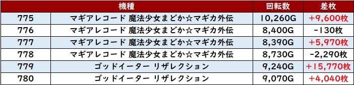 まずは「マギレコ~スマスロゴッドイーター 775~780」が機種跨ぎで大賑わい!