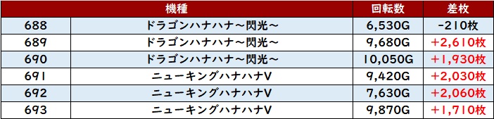 まずは「ドラハナ閃光~ニューキンV 688~693」回転数1万G超えが見られる程の高稼働を記録!