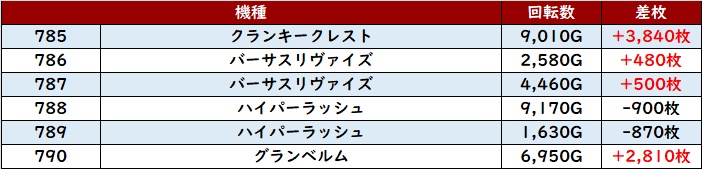 回転数11,460G且つ差枚数+9,480枚を叩き出す台もあり、こちらからも凄まじい熱量が感じられた。