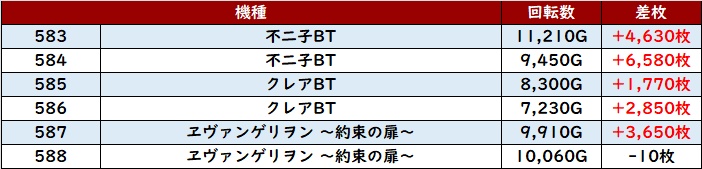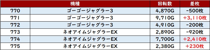 半数が差枚数+5,400枚以上と素晴らしい出玉感に加え、6台中5台が回転数1万G超えと抜群の稼働状況を見せた!