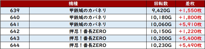 まずは「カバネリ~番長ZERO 639~644」が全台大幅プラス差枚を記録し、盛り上がりの筆頭に!