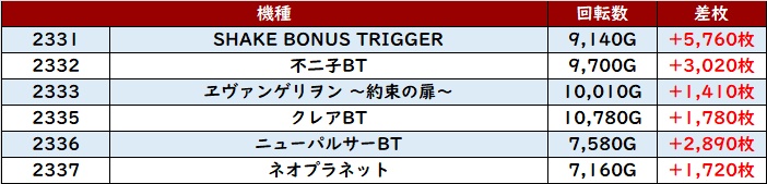更に「シェイクBT~ネオプラ 2331~2337」も全台大幅プラス差枚と絶好調!