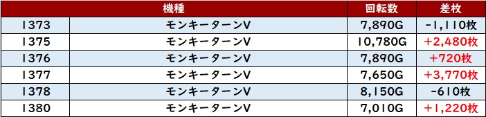 続いて「モンキー5 1373~1380」が全台回転数7,000G超えの高稼働をキープ!