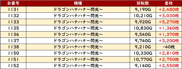 今回は「ドラハナ閃光」が全台回転数9,100G超えと衝撃的な稼働率を記録!