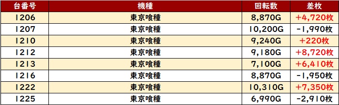 続いて「東京喰種」が差枚数+8,720枚など目を見張る出玉感のオンパレードに!