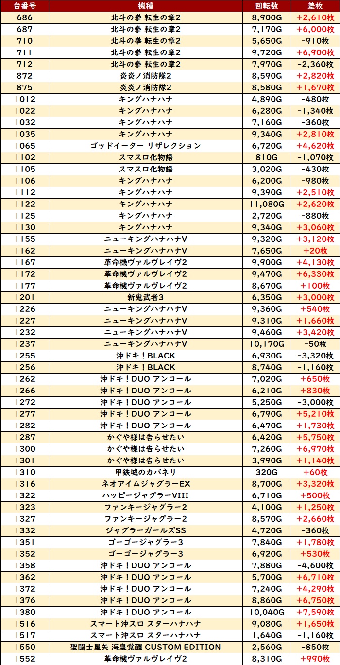 また「北斗転生2」「沖ドキDUO2」など様々な機種から好調台を確認することが出来た。