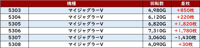 回転数8,000G超えの台が大半を占めており、中には差枚数+12,300枚以上を記録する台も複数見受けられた!