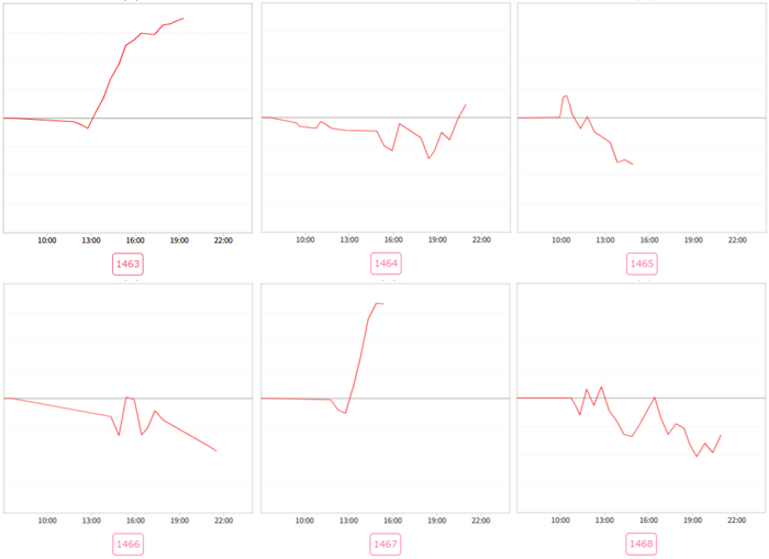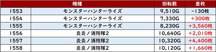 まずは「モンハンライズ~炎炎2 1553~1558」が全台回転数7,300G超えと大盛況!