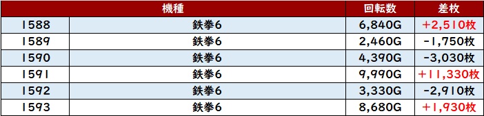 続いて「鉄拳6 1588~1593」から回転数9,990G&差枚数+11,330枚を記録する台を目撃!
