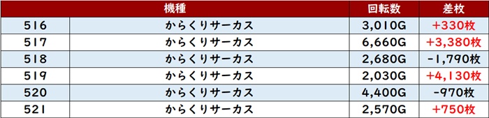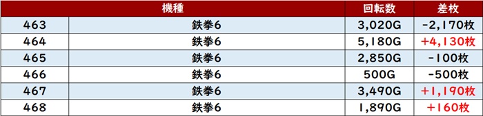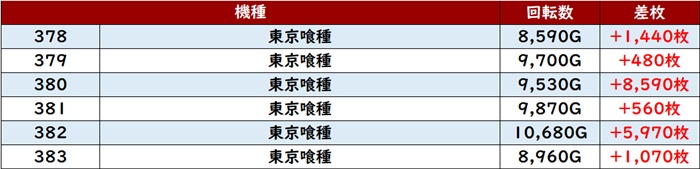 続いて「東京喰種 378~383」差枚数+8,590枚を筆頭に全台プラス差枚を記録!