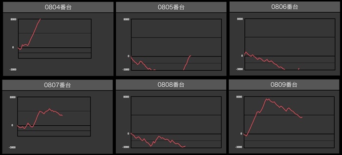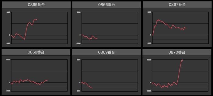 多くの台が回転数8,000G超えの高稼働となっており、その稼働も相まって大きく出玉感を伸ばす台で溢れていた。