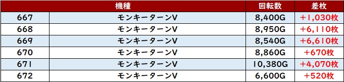 続いて「モンキー5 667~672」の大半が回転数8,400G以上と高稼働に!