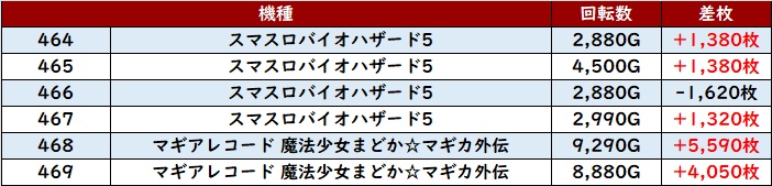続いて「スマスロバイオ5~マギレコ 464~469」から、文句なしの稼働と出玉感を記録する台を目撃!