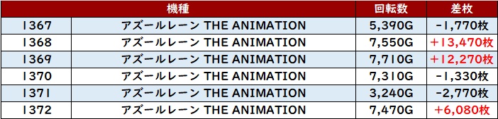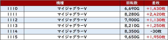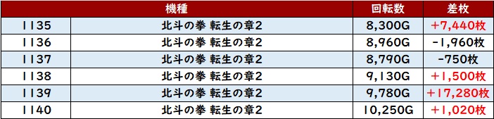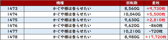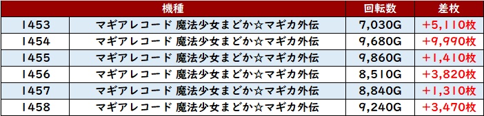 殆どが回転数8,300G以上の高稼働となっており、差枚数+17,280枚を筆頭に見事なまでの素晴らしい出玉感を多数確認することができた。