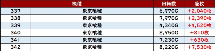 朝イチは「ヴヴヴ」「北斗転生2」「東京喰種」「ヴヴヴ2」「炎炎2」「攻殻機動隊」がフル稼働スタートとなった。