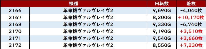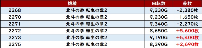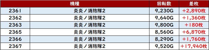 まずは「炎炎2 2361~2367」が全台回転数8,200G超え且つプラス差枚と大盛況!