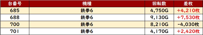 こちらも回転数9,130G&差枚数+7,530枚と一際目立つ稼働・出玉感も見られ、好調さを存分に見せつけていた。