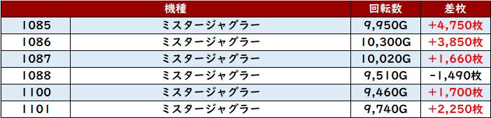 まずは「ミスター 1085~1101」が回転数1万G超えが見られる程の高稼働に!
