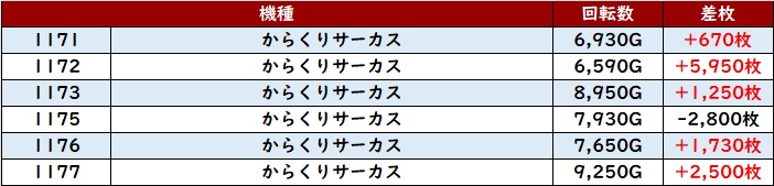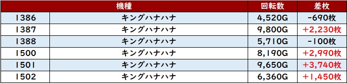 こちらも「ミスター 1085~1101」同様に回転数1万G超えの台や大幅に出玉感を伸ばす台が見られ、終日大盛況となった。