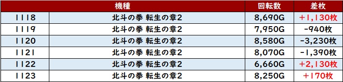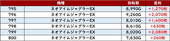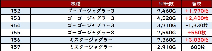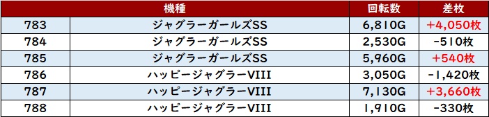 全台プラス差枚且つ回転数7,600G超えと圧巻の稼働で存在感充分の活躍を見せた。