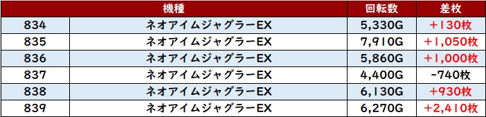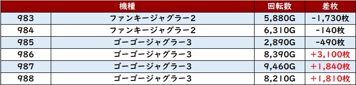 6台中5台が大幅プラス差枚となり、中には差枚数+1.1万枚超えの台も確認でき、盛り上がりの中心となった!