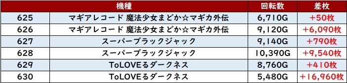 まずは「マギレコ~ToLOVEる 625~630」が全台プラス差枚に!