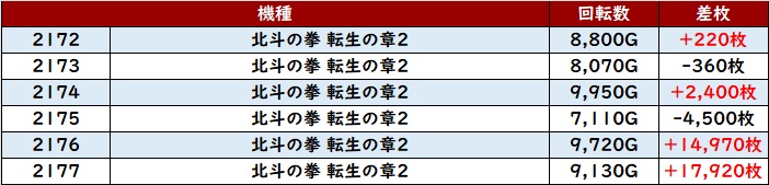 更に「北斗転生2 2172~2177」の殆どが回転数8,000G超えの高稼働に!