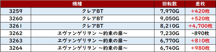 まずは「スマスロ北斗 4232~4237」が状況の良さから全台プラス差枚と素晴らしい結果に!