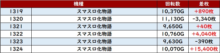 続いて「スマスロ化物語 1319~1324」からも差枚数+15,400枚と驚きの出玉感を目撃!