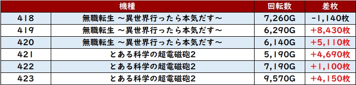 続いて「無職転生~とある超電磁砲2 418~423」が大半が差枚数+4,100枚超えと目を見張る結果に!