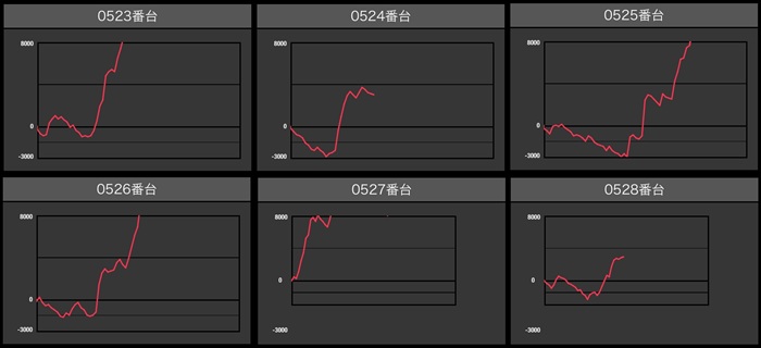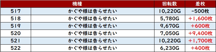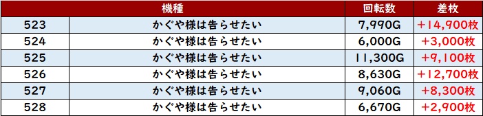 まずは「かぐや様 523~528」が全台大幅プラス差枚と大熱狂!