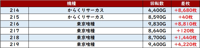 まずは「からくりサーカス~東京喰種 214~219」機種跨ぎ全台プラス差枚を記録!
