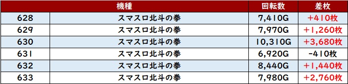 続いて「スマスロ北斗 628~633、628~633」の大半が回転数7,300G超えと高稼働に!