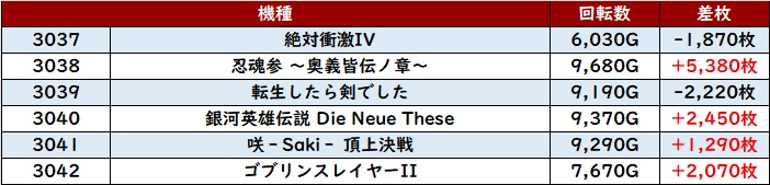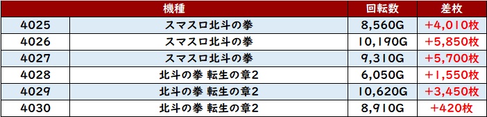 まずは「スマスロ北斗~北斗転生2 4025~4030」全台プラス差枚と抜群の結果に!