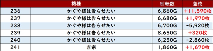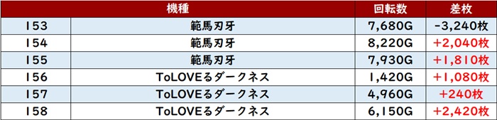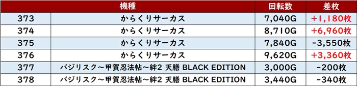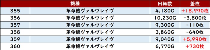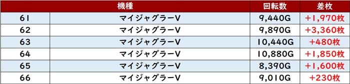全台回転数7,500G超えとしっかり打ち込まれたことで、差枚数+13,010枚を筆頭に殆どが大幅プラス差枚と大盛況となった。