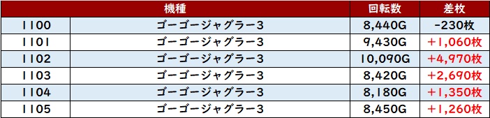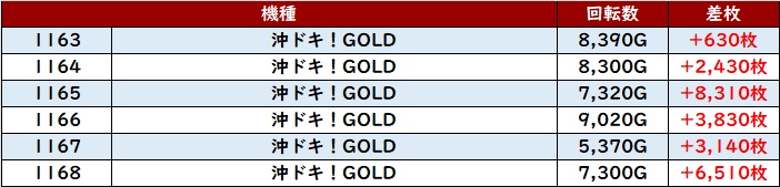 まずは「沖ドキGOLD 1163~1168」が全台プラス差枚と充実感満載の結果を記録!