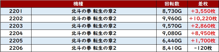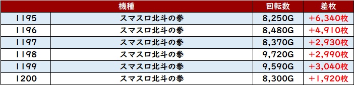まずは「スマスロ北斗 1195~1200」が回転数8,200G超えの高稼働をマーク!